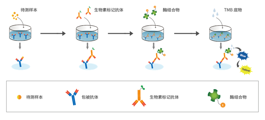 本试剂盒采用的是双抗夹心酶联免疫吸附 检测技术(ELISA)。测定样品中人磷酸化 Tau pT231 蛋白水平。向预先包被了抗人磷酸化Tau pT231 蛋白抗体的酶标孔中,加入标准品和样本,温育后,加入生物素标记的抗磷酸化 Tau pT231 蛋白抗体。再与 HRP 标记的链霉亲和素结合,形成免疫复合物,再经过温育和洗涤,去除未结合的酶,然后加入显色底物 TMB,产生蓝色,并在酸的作用下转化成最终的黄色。最后,在 450 nm 处测定反应孔样品吸光度(OD)值,样本中的人磷酸化Tau pT231蛋白浓度与 OD 值成正比,通过绘制标准曲线计算出样本中人磷酸化Tau pT231 蛋白的浓度。